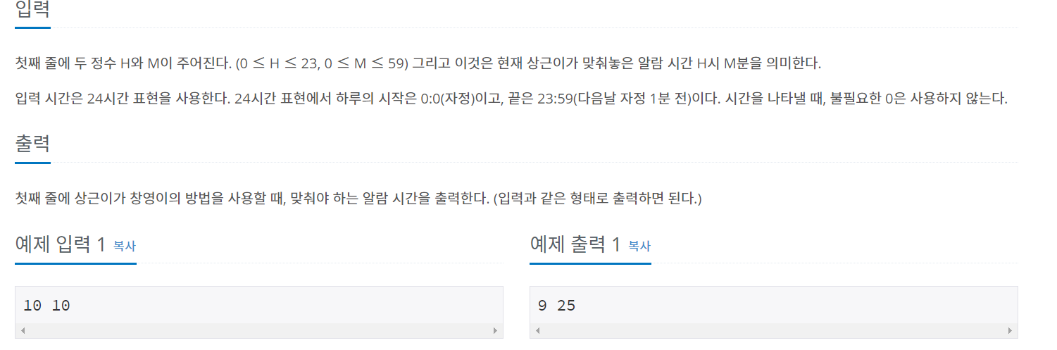 cin cout과 45분을 시,분에 더하고 빼주는 부분만 신경쓰면 크게 어려운 문제는 아니다.