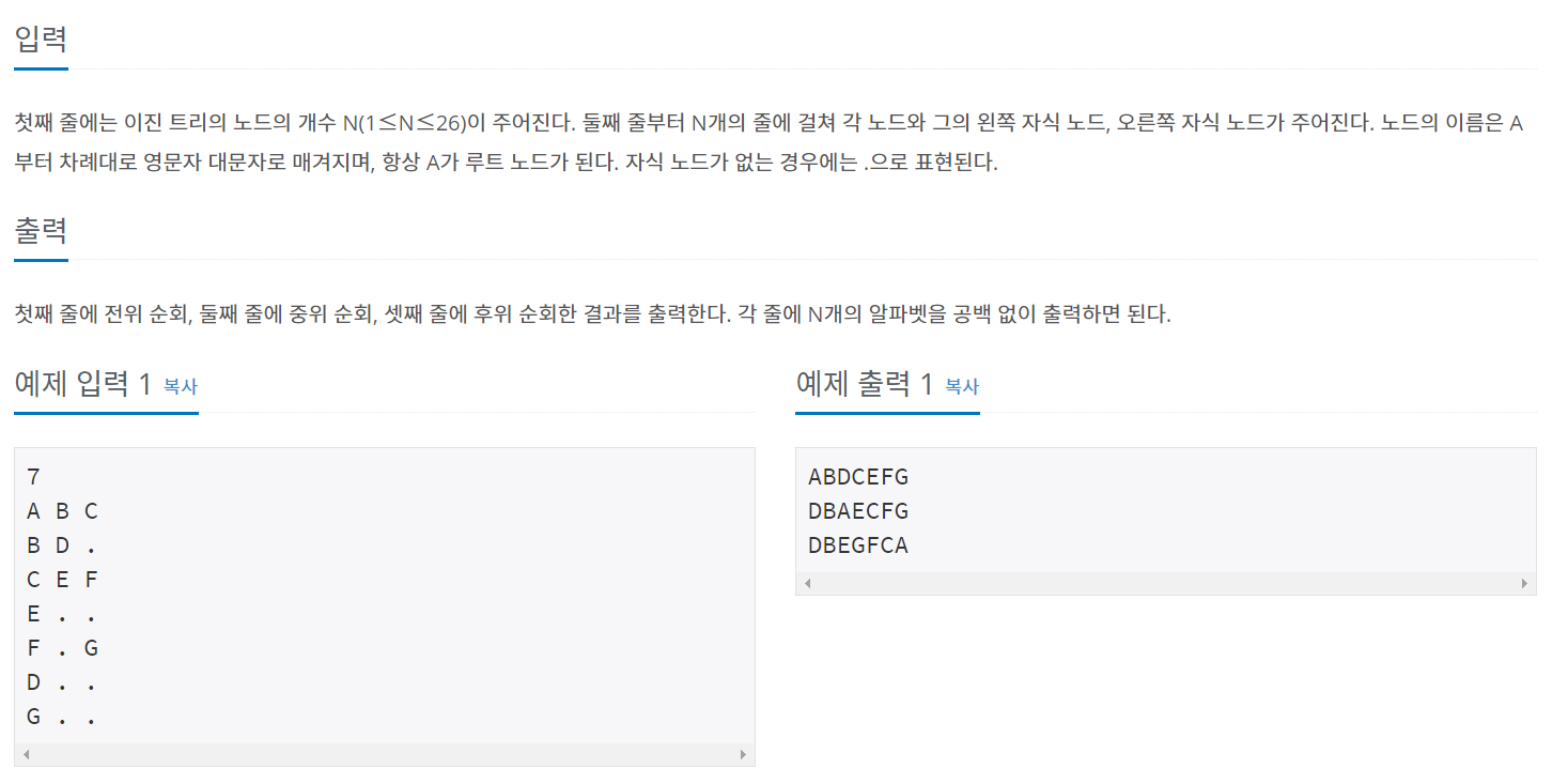 전위 순회, 중위 순회 및 후위 순회의 출력 방식은 위에 자세히 설명되어 있고, 왼쪽 오른쪽을 탐색할때, 재귀함수가 필요한 부분은 그때마다 호출해서 출력해주면 된다.