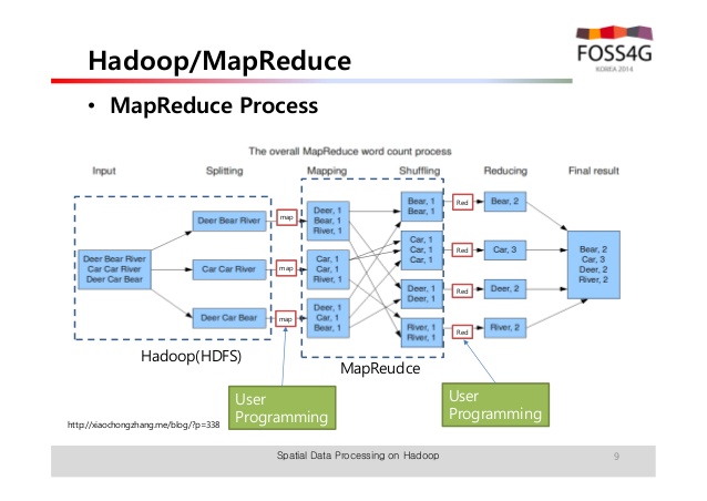 MapReduce는 Hadoop 클러스터의 데이터를 처리하기 위한 시스템으로 총 2개(Map, Reduce)의 phase로 구성된다. Map과 Reduce 사이에는 shuffle과 sort라는 스테이지가 존재한다. 각 Map task는 전체 데이터 셋에 대해서 별개의 부분에 대한 작업을 수행하게 되는데, 기본적으로 하나의 HDFS block을 대상으로 수행하게 된다. 모든 Map 태스크가 종료되면, MapReduce 시스템은 intermediate 데이터를 Reduce phase를 수행할 노드로 분산하여 전송한다.